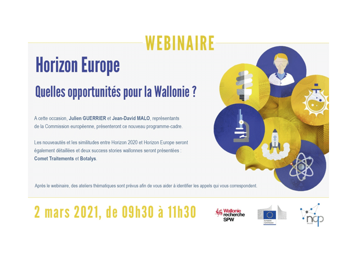 - Séance du 2 mars : infos et inscription : Webinaire 2 mars : Séance de lancement du programme Horizon Europe en Wallonie (ncpwallonie.be)